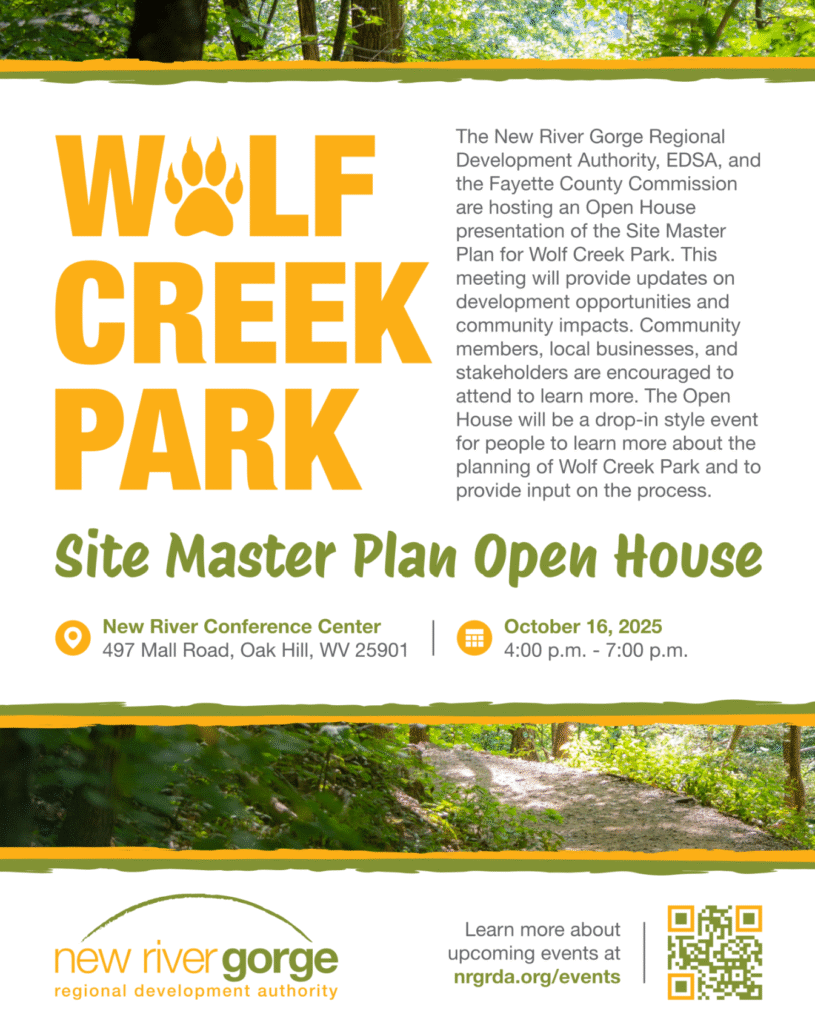 The site planning process for Wolf Creek Park is being undertaken through a partnership between the Fayette County Commission and the New River Gorge Regional Development Authority with technical assistance and grant support from the Activating Natural Resource Economies program of the Conservation Fund. Businesses and community organizations with operations and programming related to Wolf Creek Park will remain engaged throughout the planning and development stages.
